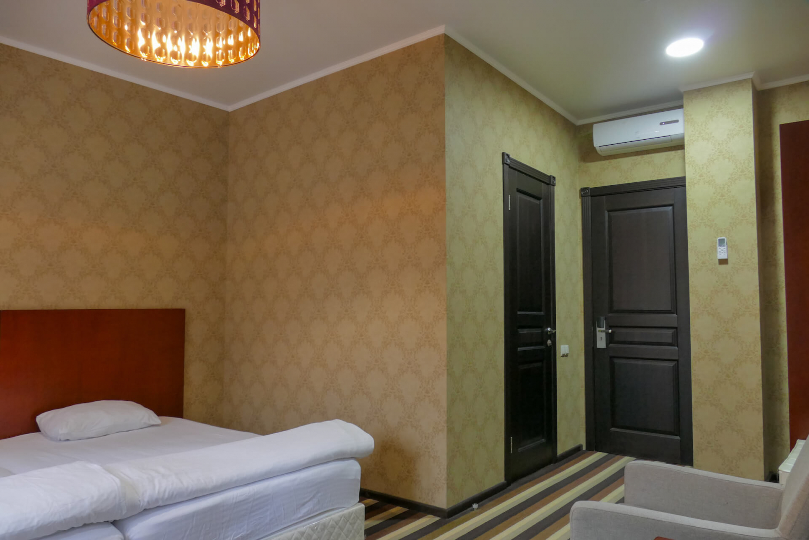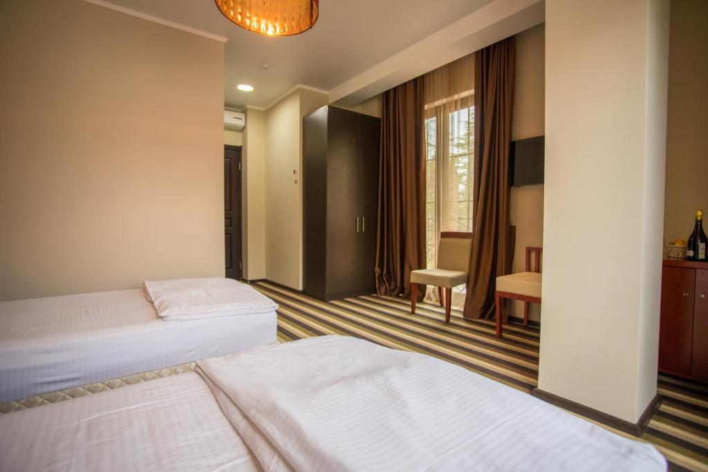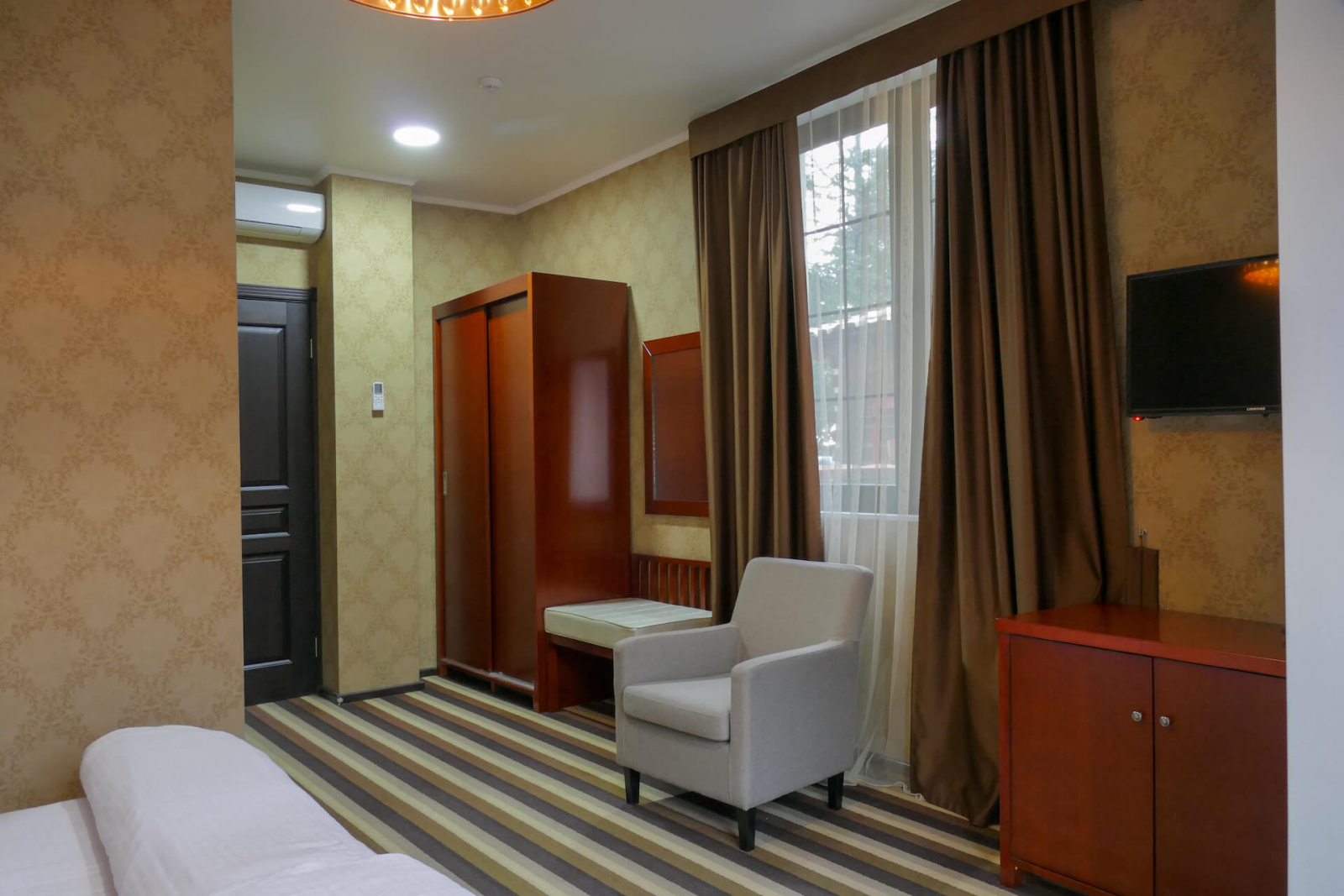 Площадь номера - 27 кв.м. 2 осн. места. 1 доп. место. Мебель: вешалка, зеркало, комод, кровати односпальные (2), прикроватные тумбочки, стол, стулья, шкаф. Оборудование: кондиционер, сейф, телевизор, холодильник. Санузел: с душем, туалетные принадлежности, фен. Сервис: Wi-Fi бесплатно, смена полотенец, смена постельного белья, уборка номера.