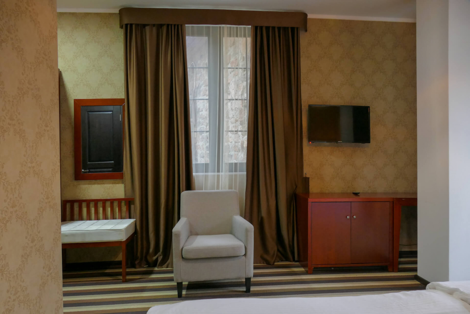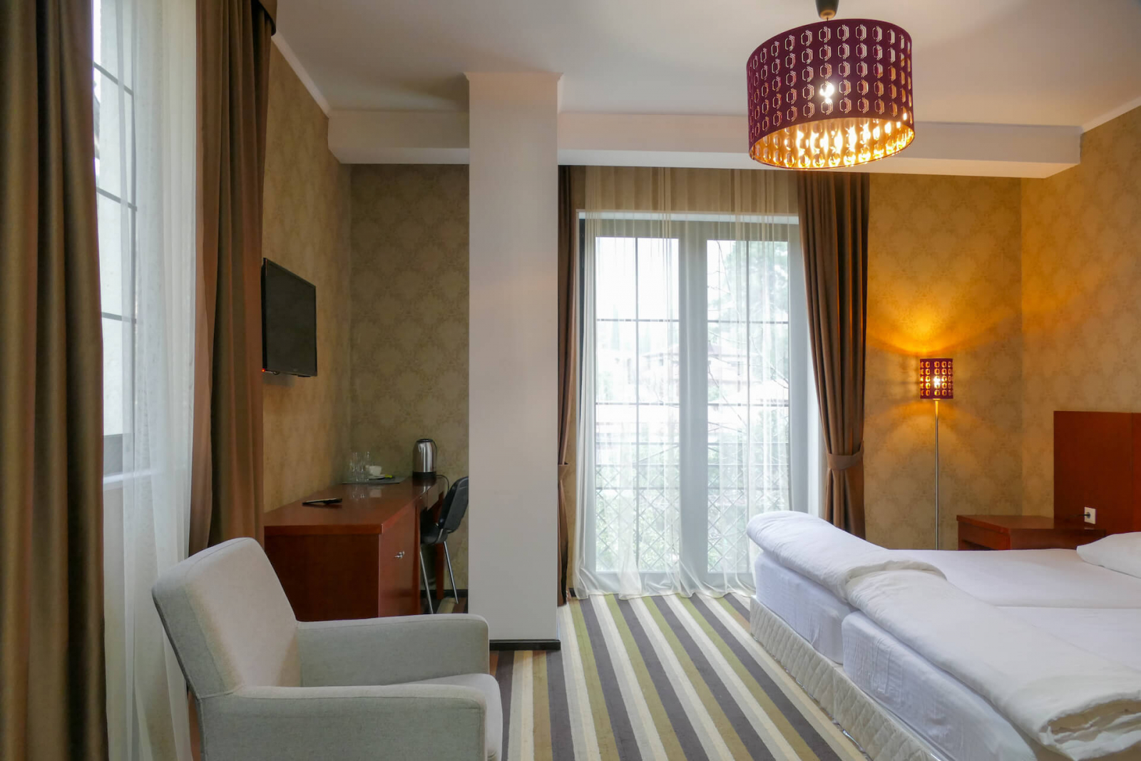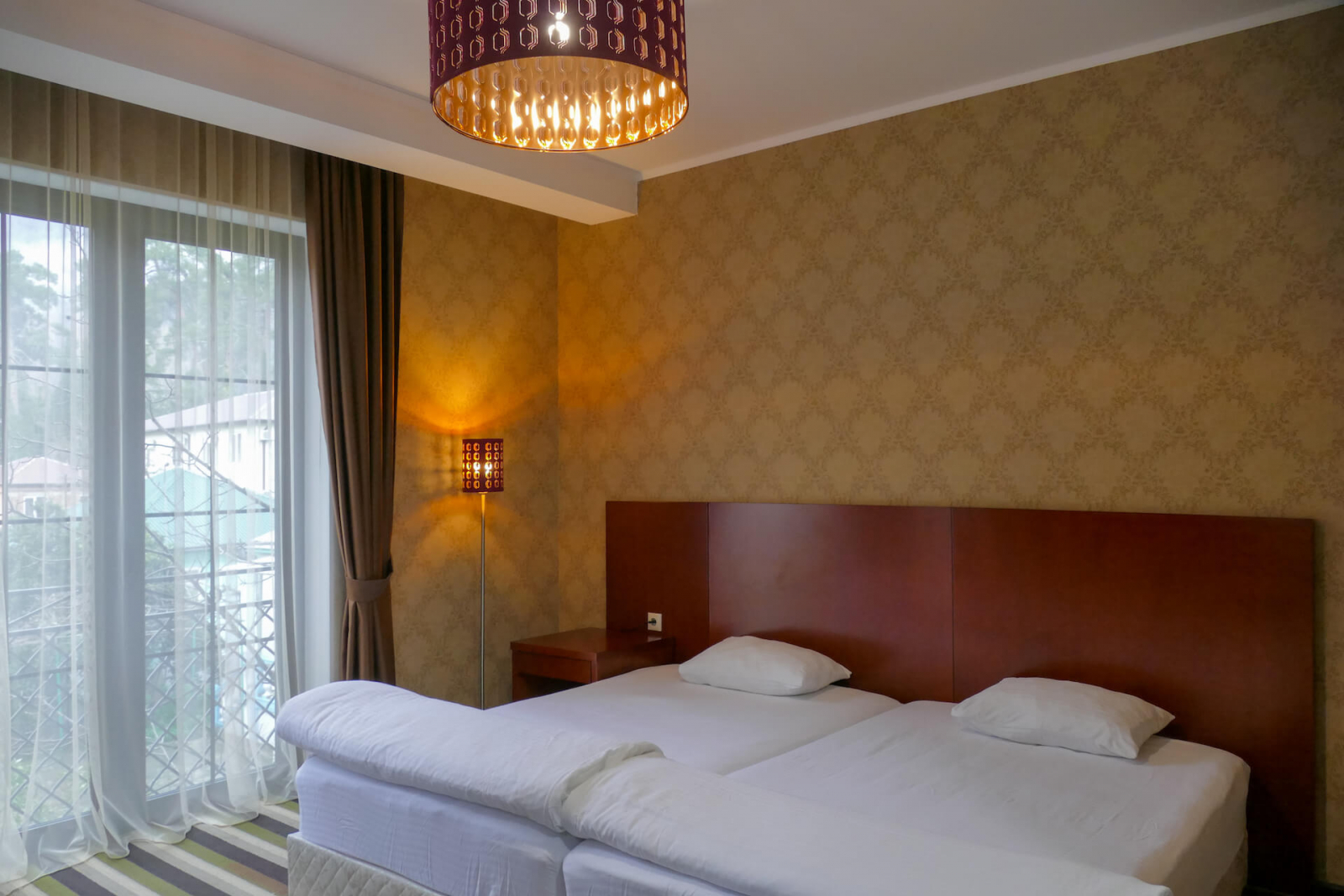 Площадь номера - 27 кв.м. 2 осн. места. 1 доп. место. Мебель: вешалка, зеркало, комод, кровати односпальные (2), прикроватные тумбочки, стол, стулья, шкаф. Оборудование: кондиционер, сейф, телевизор, холодильник. Санузел: с душем, туалетные принадлежности, фен. Сервис: Wi-Fi бесплатно, смена полотенец, смена постельного белья, уборка номера.