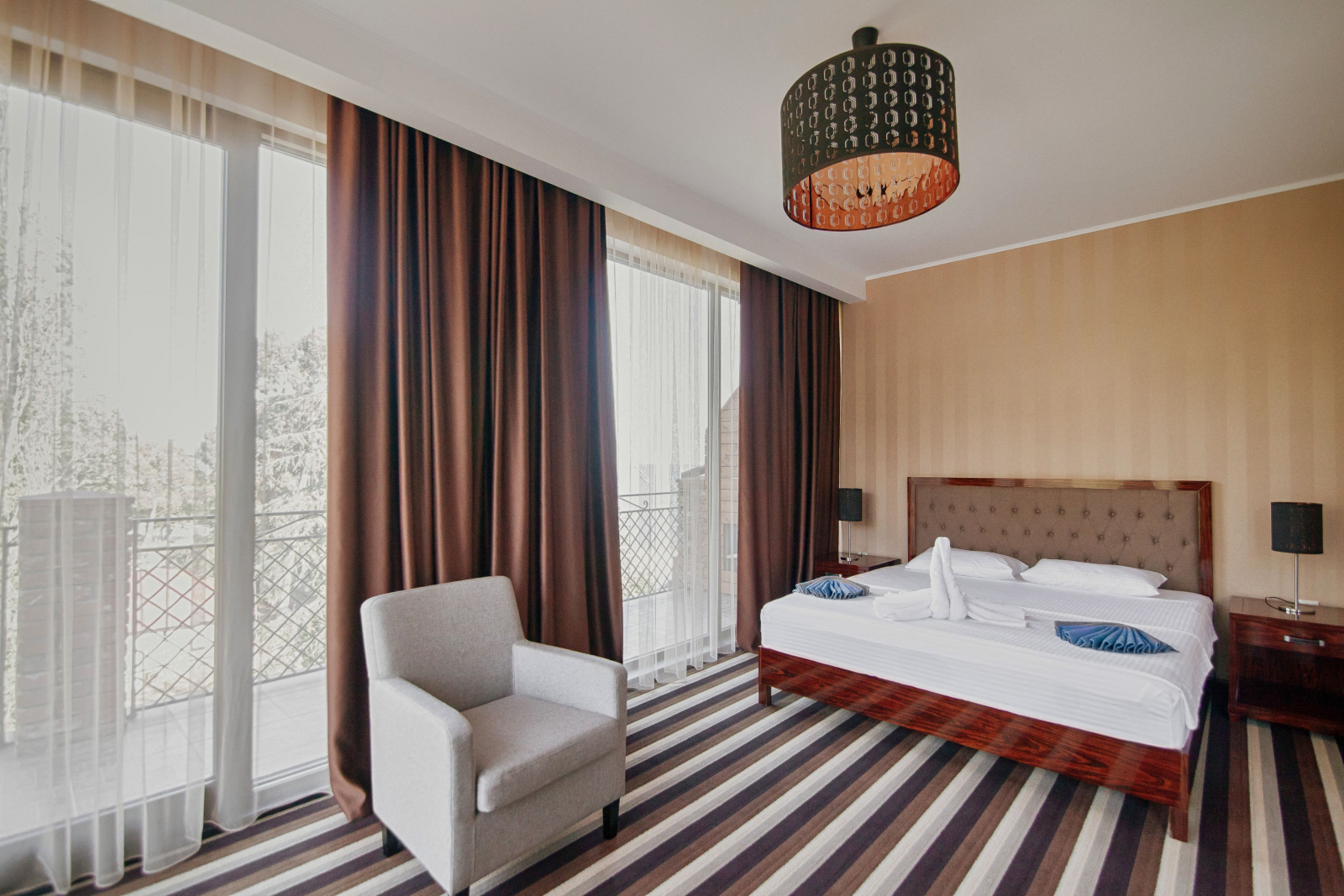 Площадь номера - 34 кв.м. 2 осн. места. 2 доп. места. Балкон. Мебель: вешалка, диван раскладной, зеркало, кресло, кровать двуспальная, прикроватные тумбочки, столик журнальный, столик туалетный, шкаф. Оборудование: кондиционер, сейф, телевизор, холодильник. Санузел: с ванной, туалетные принадлежности, фен. Сервис: Wi-Fi бесплатно, смена полотенец, смена постельного белья, уборка номера.